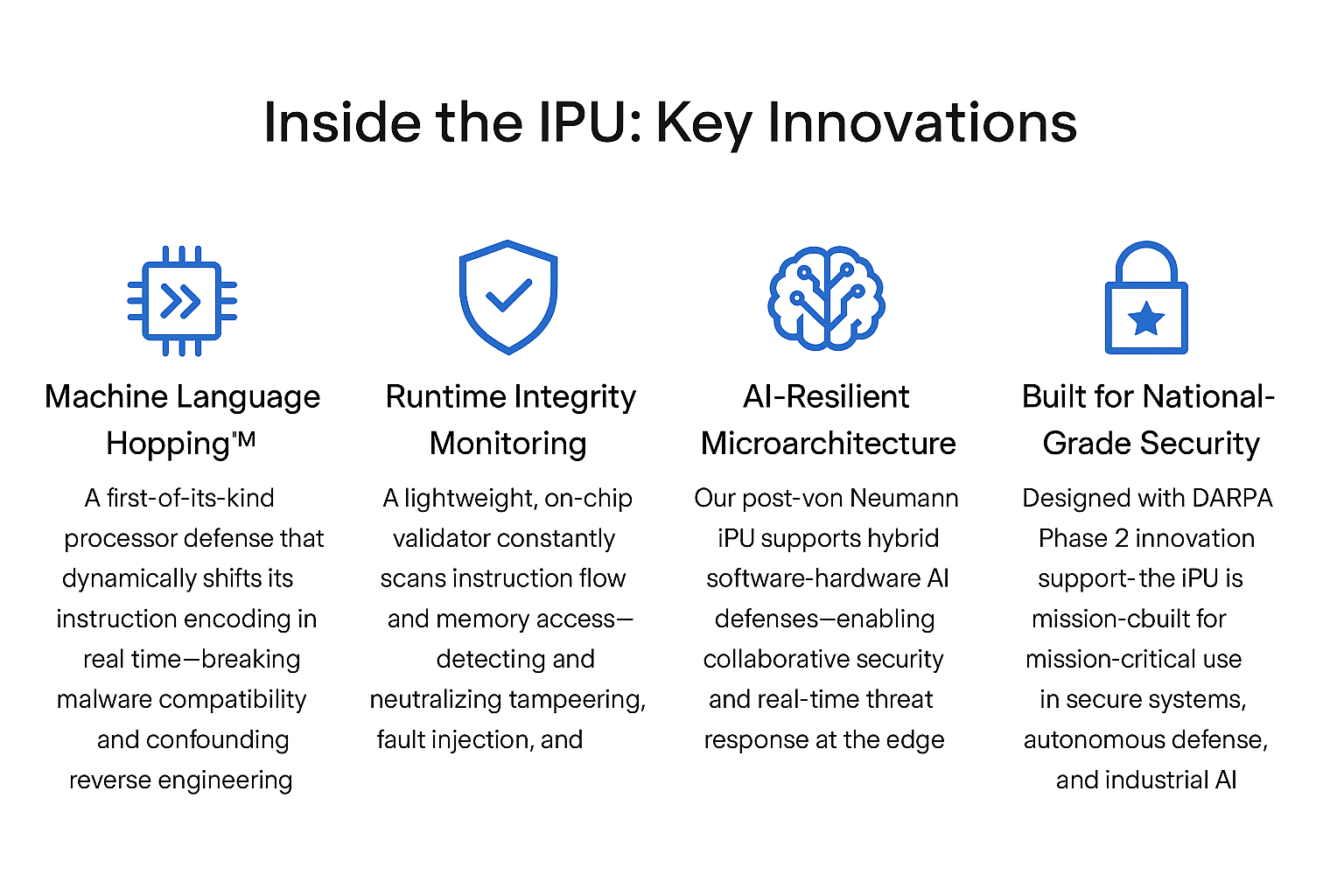 Through DARPA Phase 2 support, our iPU introduces Machine Language Hopping™, runtime integrity validation, and AI-driven countermeasures — enabling post-von Neumann resilience for secure national systems, edge computing, and enterprise AI.